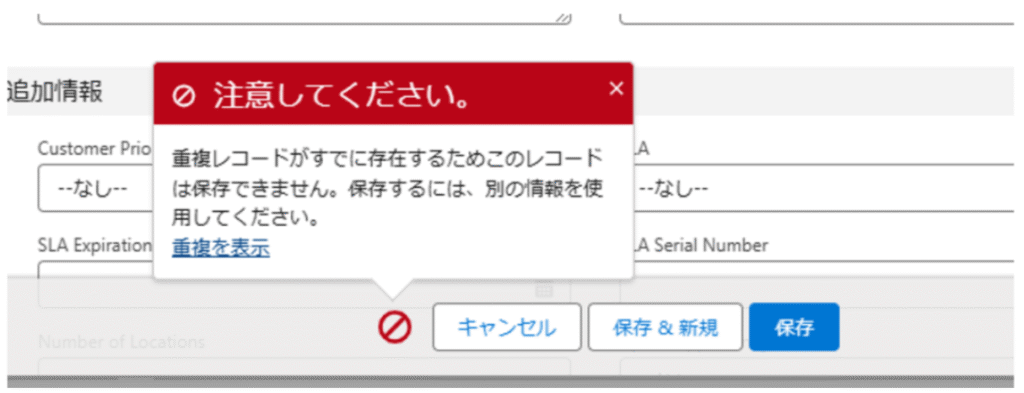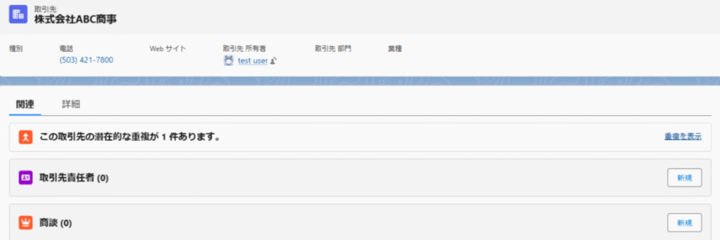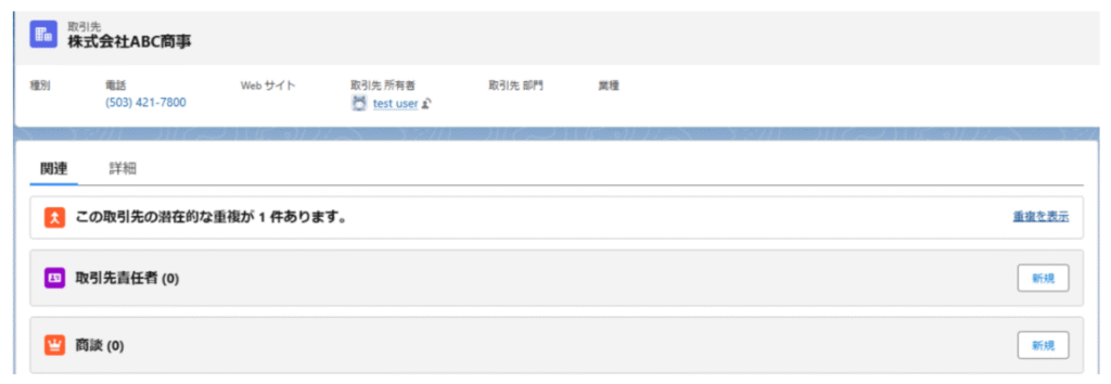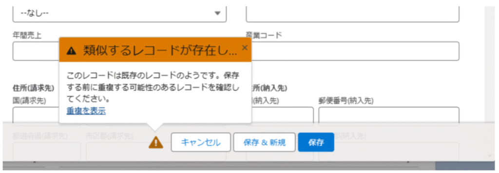 ※上記表示が出ない場合は、Lightningレコードページを編集して「潜在的な重複」コンポーネントを配置することで、表示が可能になります。