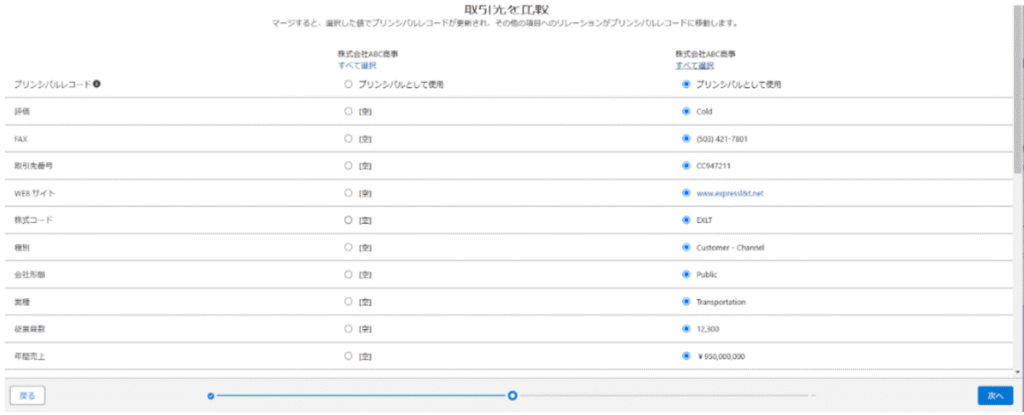 • 両レコードの項目で差分が生じているものについては、マージ画面上でどちらの項目を残すか、項目ごとに選択