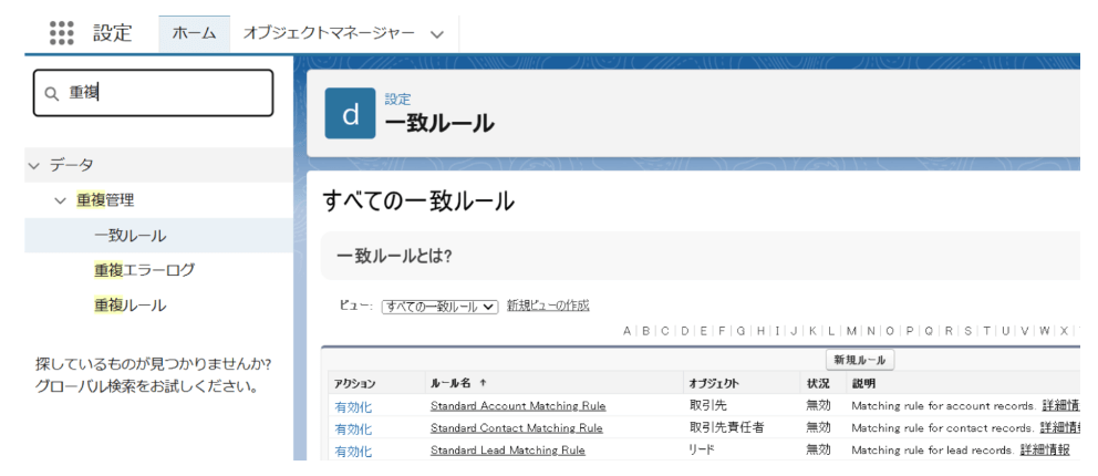 ①Salesforceの設定画面を開き、「重複管理」 → 「一致ルール」 を選択する。