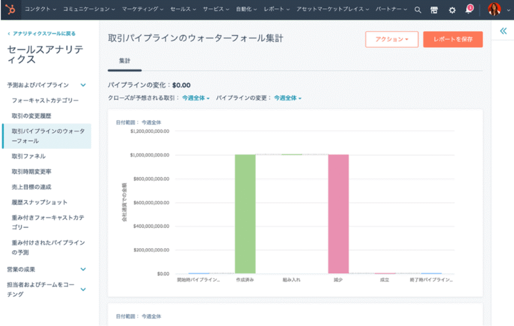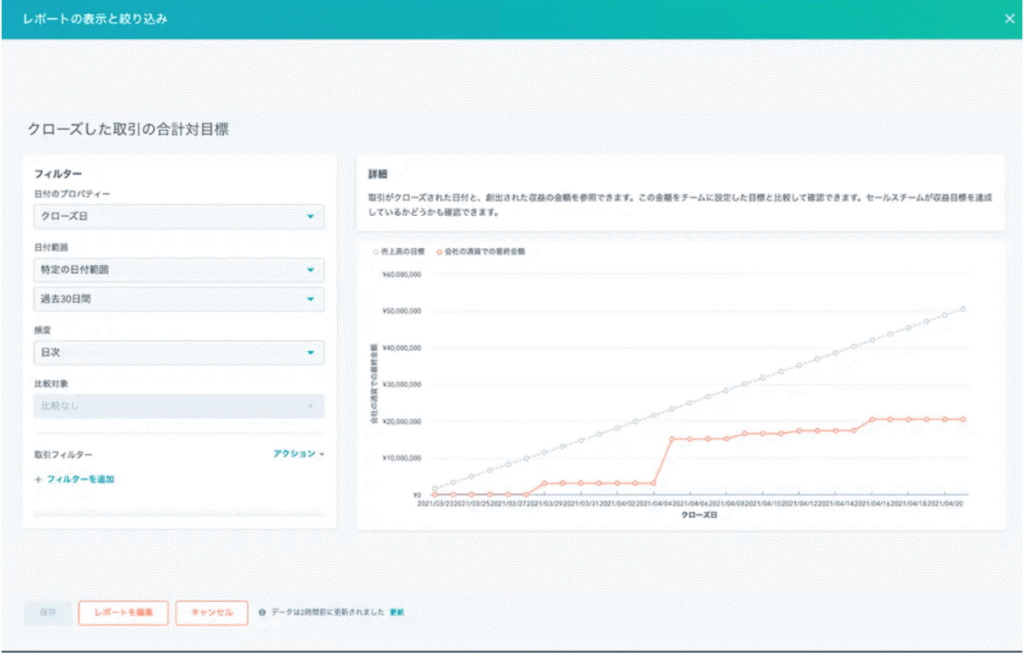 - 営業活動のパフォーマンスをダッシュボードで可視化し、売上予測や収益追跡ができます