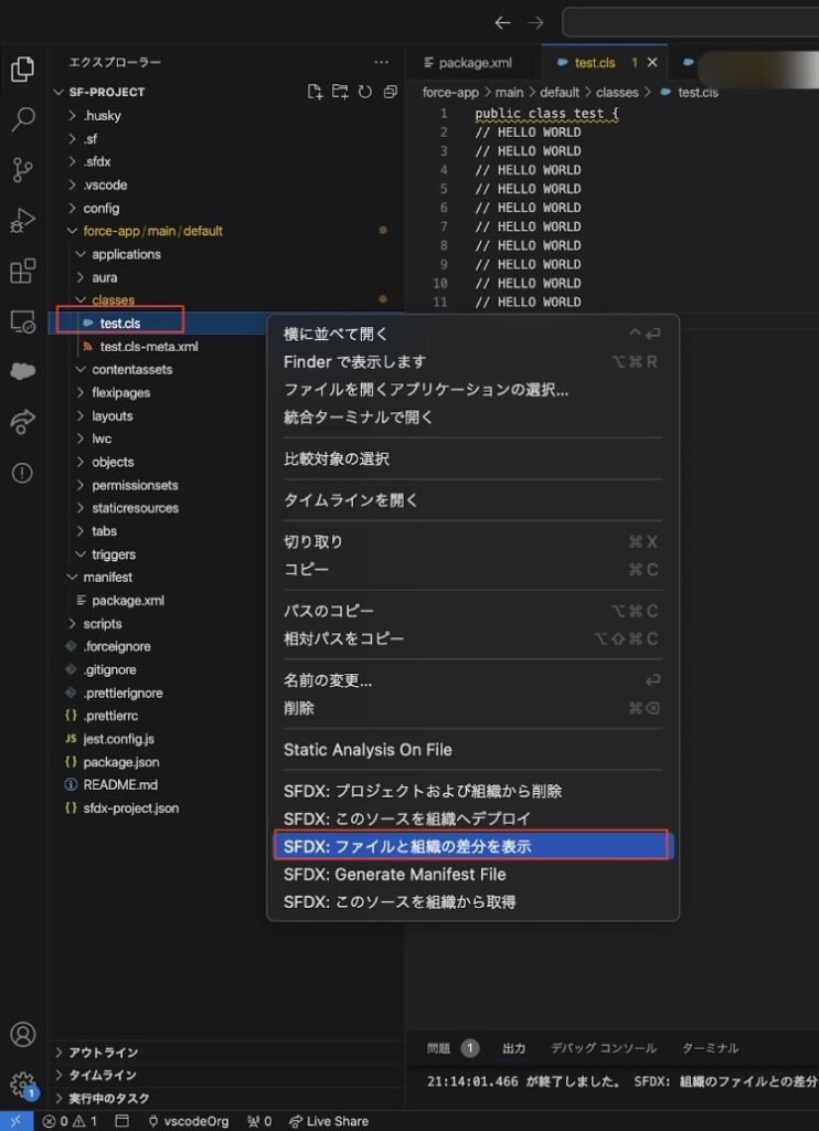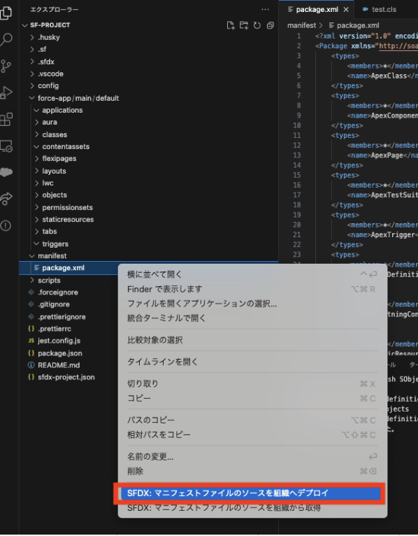 manifest/package.xmlを右クリックし、「SFDX: マニフェストファイルのソースを組織から取得」を選択します。