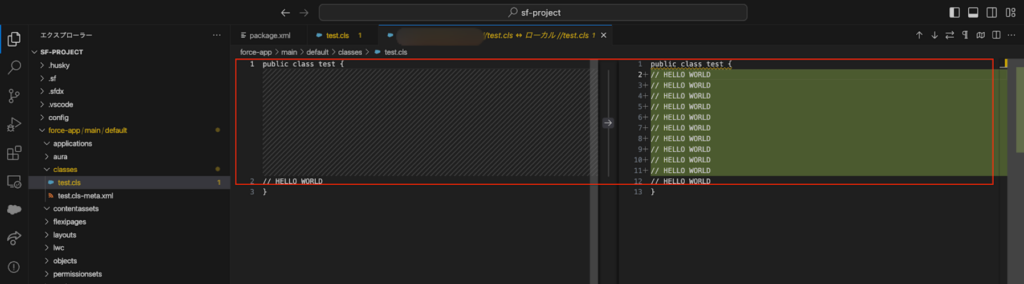 VSCodeはローカルのソースコードとSalesforce組織のコードの差分を表示してくれるため、どの部分が変更されたのかが一目で確認でき、開発のミスを減らせます。